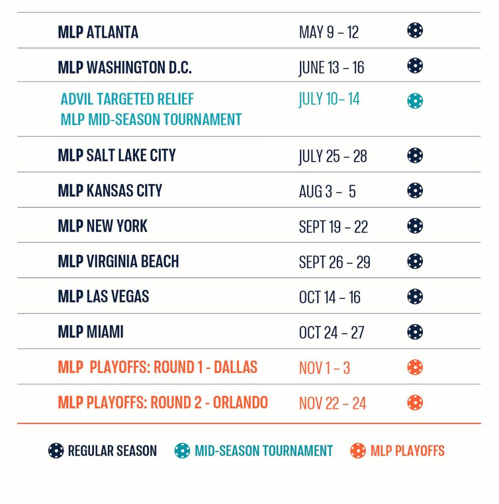 The 2024 MLP by Margaritaville season schedule will consist of a variety of events, spread throughout the country to bring Major League Pickleball action to more places than ever before. The bulk of the 2024 season will consist of regular season events, each featuring a collection of the 22 MLP teams playing multiple matches.