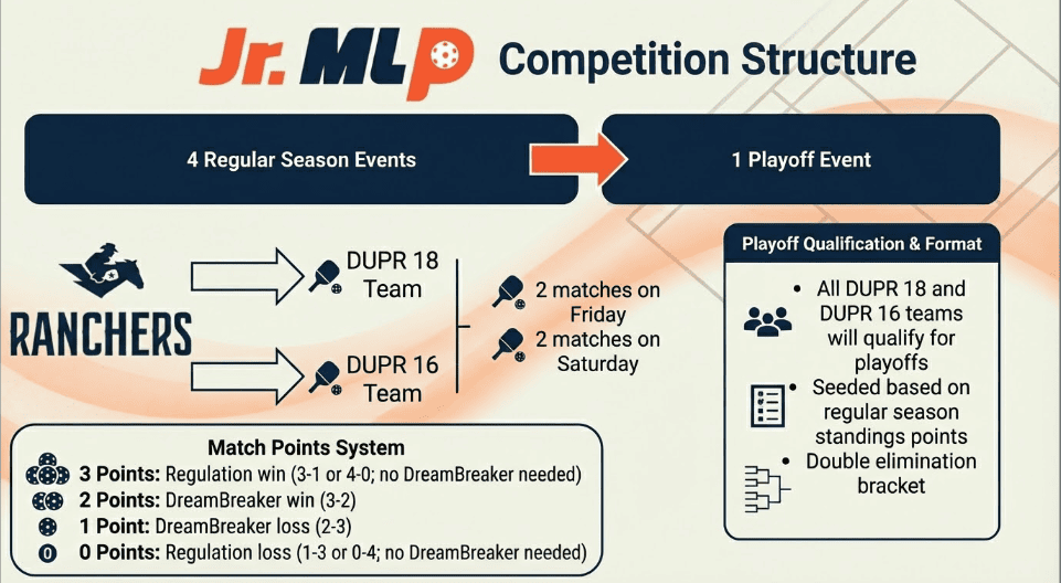 Jr.MLP will use the same MLPlay™ gameplay format, where boys and girls play together on a level playing court. In this format, team matches are composed of four games, with the first two (2) games being Junior Girls Doubles or Junior Boys Doubles, and the final two (2) games consisting of Junior Mixed Doubles. If teams are tied after the four (4) games, an innovative singles tiebreaker known as a DreamBreaker™ is played to determine the winner.