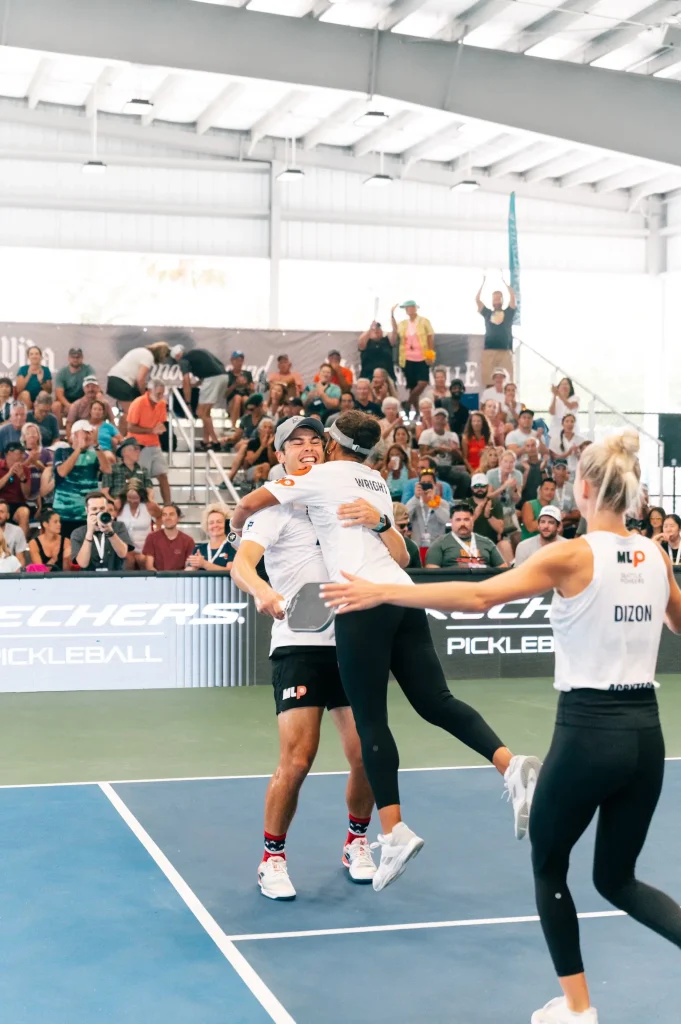 At 12-15, an incredible offensive point by both sides won by the 5s had another side of the crowd clapping back with “Let’s go 5s!” – closing the gap to 13-15 for the 5s. A forehand putaway by Anna Leigh Waters at 16-17, had Anna Leigh screaming “Yeah!”. At 17-17, BLQK challenged a close out call made by the 5s, the call stood, the BLQK bears lost a video challenge, and the score was brought to 18-17. In one of the most incredible points seen Sunday morning at 18-18, Maggie Brascia showed her underrated defensive skillset. That combined with Andrea Koop’s cunning anticipation, won them the point, bringing the crowd to a thunderous applause. At 18-20, yet another mind-blowing point was played out by both sides, with a fiery hands battles involving all four players on the court, with a backhand putaway hit at Jansen’s left foot winning BLQK the point. It didn’t stop after that, with every point thereafter being some of the best points seen in Pickleball history. BLQK came out victorious with a 25-23 win after a 44 minute jaw-clenching game, but all players on the court showed why this is the highest level and quality of pickleball being played before our very eyes.