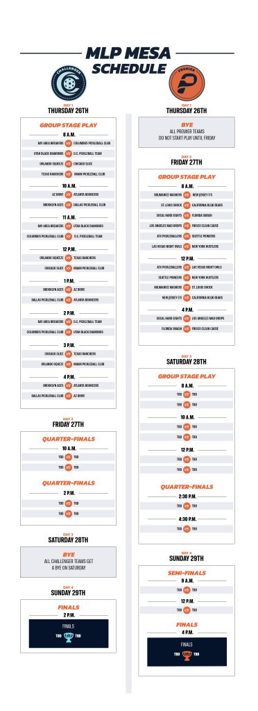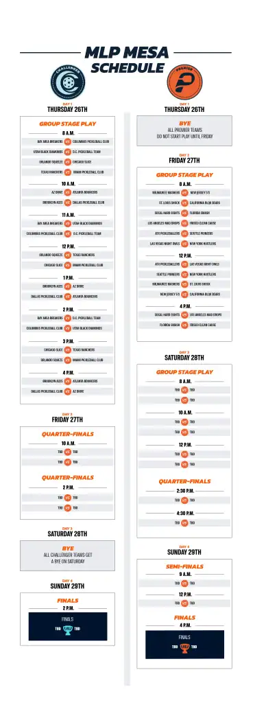 The format of play, including group play and single-elimination (knockout) rounds, will be determined by MLP. Typically, there will be initial group/pool play followed by a single-elimination format. MLP may adjust the format for scheduling purposes, broadcasting purposes, inclement weather, or other reasons, at the sole discretion of MLP.
