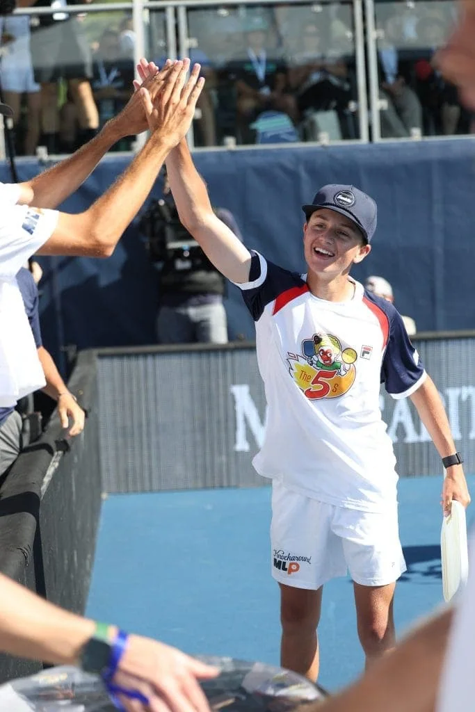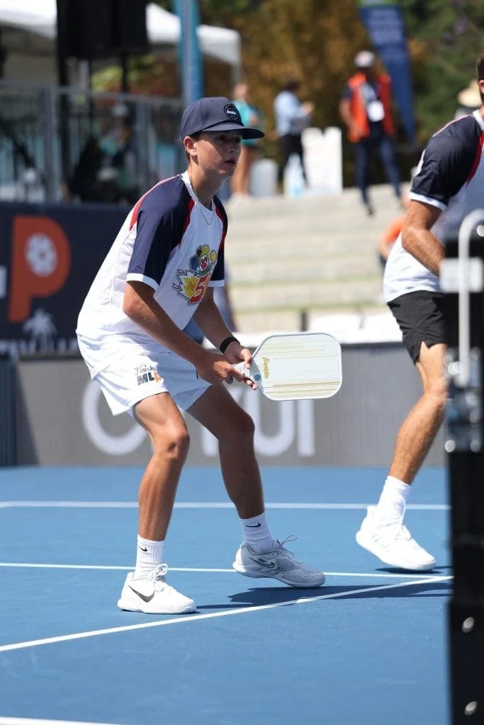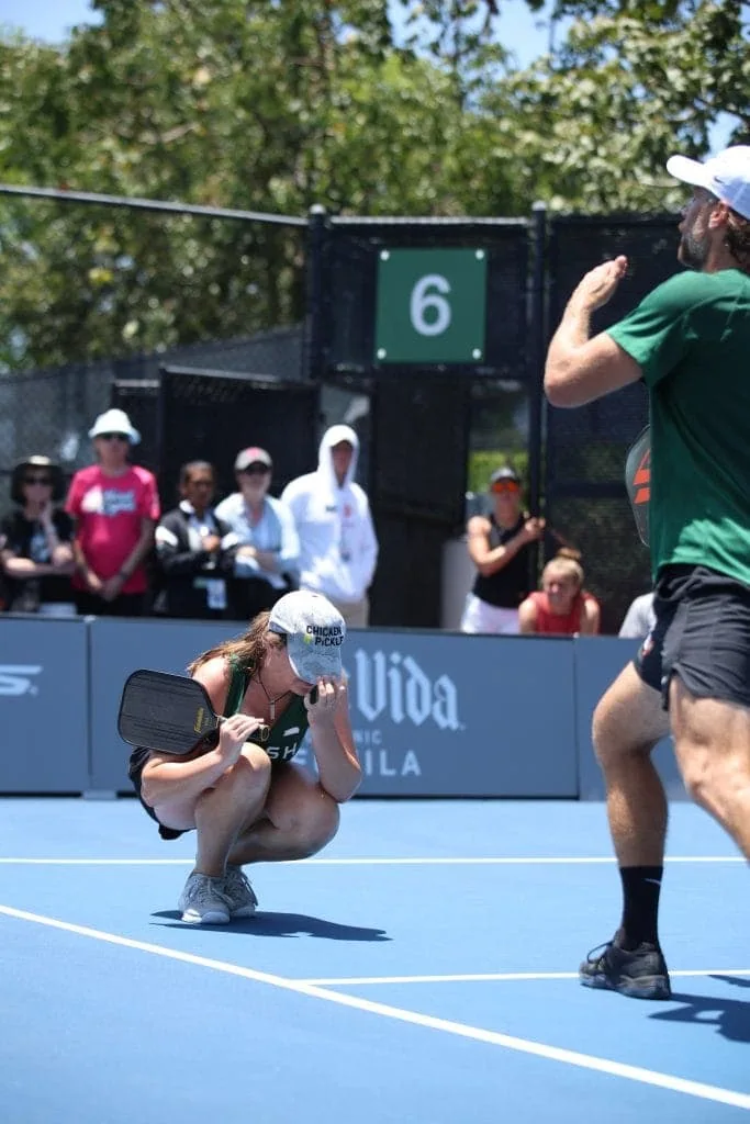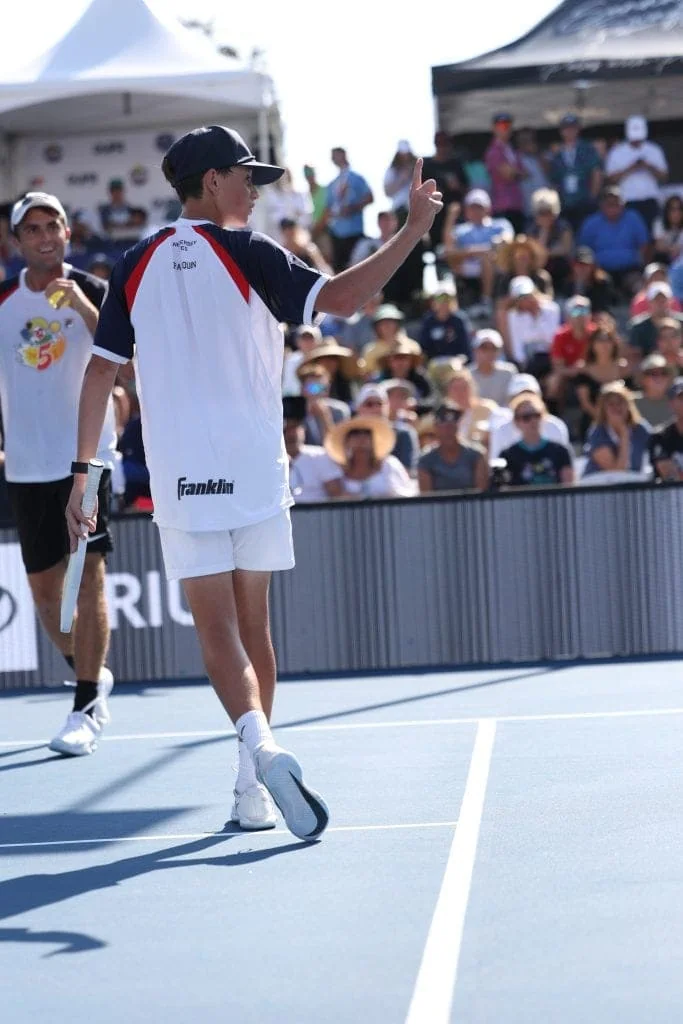 The youngest mixed doubles duo of the weekend was the 5’s Anna Leigh Waters and Hayden Patriquin as they aim to dictate the pace of the game, taking the initiative in most speed-ups, hand battles, and finishing plays. They head into halftime with an 11-6 lead, showcasing their control. At 8-12, the intensity of the game rises as tensions grow between the young players. ATX’s Gabe Tardio demonstrates his frustration by gesturing the missed ball and expressing his emotions towards Hayden and Anna Leigh. Waters and Patriquin regain their composure and maintain their lead at 18-14, leading the Pickleballers to call a timeout. Despite the ATX Pickleballers’ efforts to stage a comeback, they fall short, with the 5’s securing a 21-15 victory.