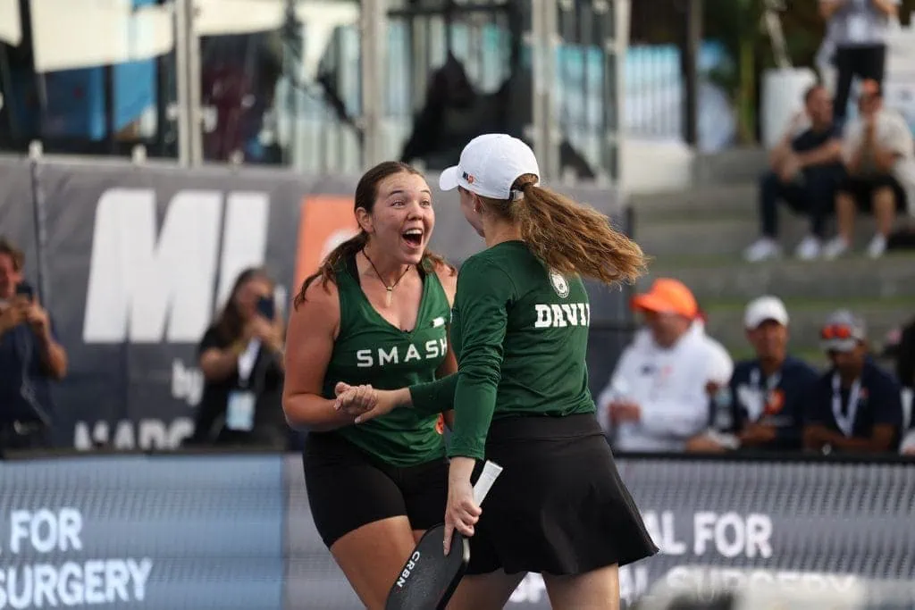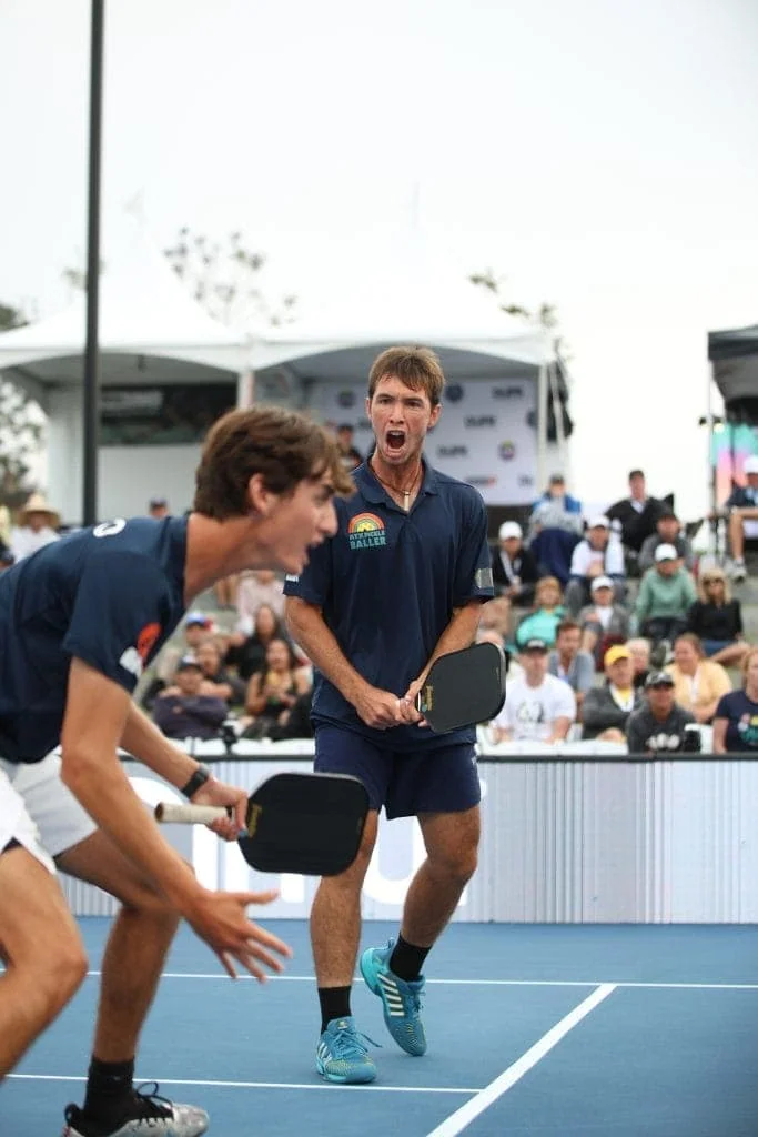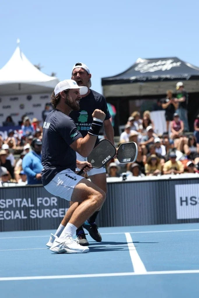 Men’s Doubles: SoCal wins 22-20 SoCal displays an aggressive start with Koller and Riley launching early attacks, gaining a 4-1 lead. Koller’s efforts keep Newman from getting caught in the kitchen. Travis delivers a sharp angled volley that Riley fails to track down, narrowing Florida’s deficit to 7-5. Travis heats up the game, but Riley cools him down with a speed-up shot. SoCal maintains an 11-7 lead at the switch. Riley confidently hits a flying erne, staring down Florida, and making it 12-7. SoCal calls a timeout when Florida mounts a comeback, with the score standing at 12-11. Kyle Yates pulls off an incredible shot in the back corner to save a game point, tying the game at 20-20. Kyle unleashes a powerful forehand speed-up to regain the ball, and Travis misses an ATP, leaving the score still tied at 20-20. Koller steps in and secures the victory with a backhand volley down the middle, winning the game 22-20. It was an amazing display by both teams.