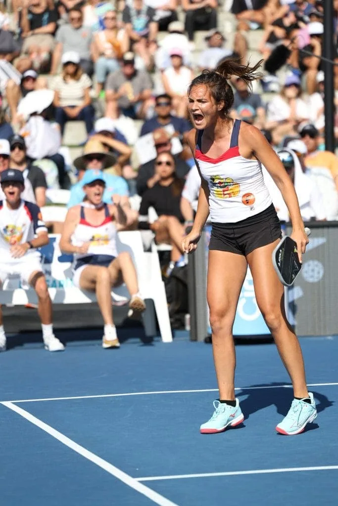 Right from the start, Parenteau displayed exceptional hand speed, emerging victorious in numerous intense exchanges. A magnificent backhand volley finish by Parenteau propelled the Mad Drops to an early 8-3 advantage. However, the 5’s Anna Leigh Waters(ALW) responded with a powerful body-bag shot into Tereschenko, narrowing the gap to 8-6.